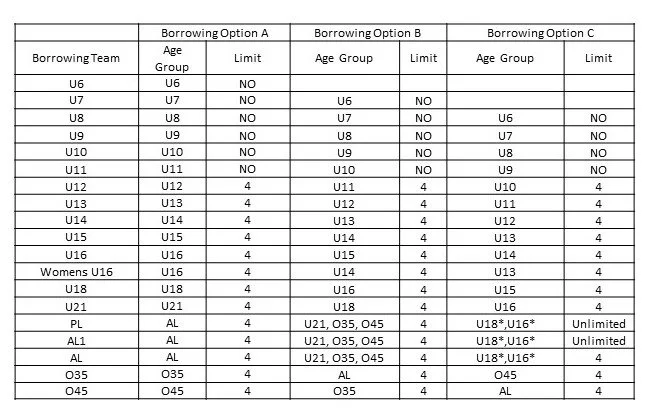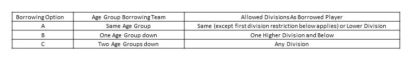 The table above lists the different age goups which a team in a particular age group can borrow. In addition to age group restrictions, there are restrictions based on the division of the borrowing team.